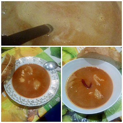 Közben egy közepes fazékba kb. 3 dl vízben feloldom a halászlé alapot vagy halászlé kockát.