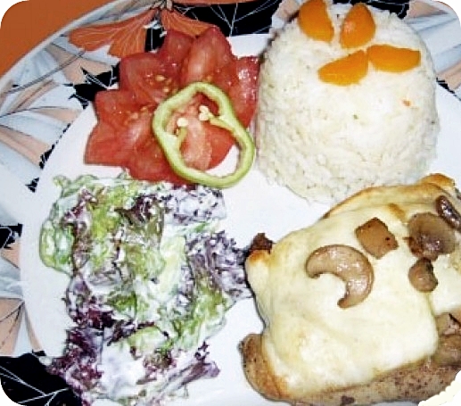 - A elősütött csirkemellet tűzálló tálba fektetjük, minden egyes hússzeletre evőkanálnyi párolt gombát teszünk, betakarjuk egy-egy szelet sonkával, a maradék gombát a levével együtt és a szalonnát a hússzeletek mellé rakjuk.