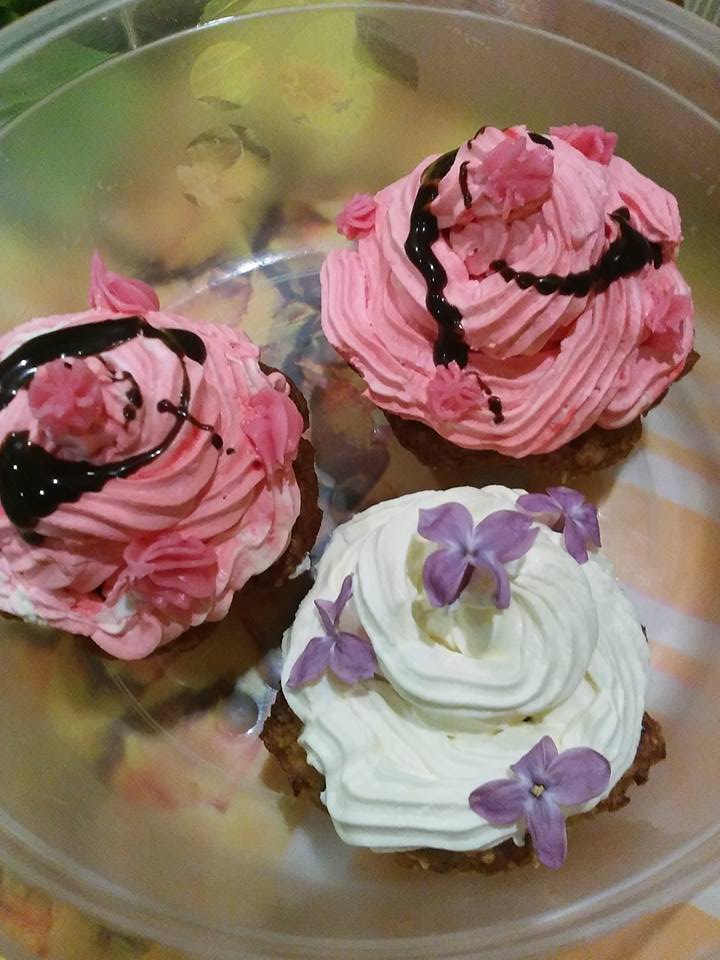 A krémet két kis tálkába tettem, egyikhez kevés sárgát, a másikhoz több piros ételfestéket, majd habzsákba téve, nagyobb méretű habcsővel felszerelkezve kis halmokat nyomtam a muffinokra. Persze a sósra nem, csak az édesre :)...a világos színű halmokat orgona virággal (ami ehető virág) díszítettem, a piros pedig apró rózsaszín marcipánvirágokkal van díszítve, amit ha folyékonyabbra készítünk, úgyan úgy lehet habzsákba téve díszíteni vele.