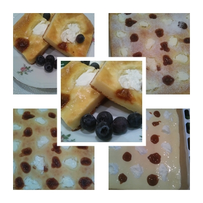 Egy mély tálba a száraz hozzávalókat összekeverjük, majd beleütjük a tojást, a kefírt és egynemű masszává keverjük. Egy magasabb falú gáztepsit sütőpapírral kibélelünk beleöntjük a masszát. Egy teáskanállal tejföl illetve sárgabarack lekvár pöttyöket teszünk a tészta tetejére.