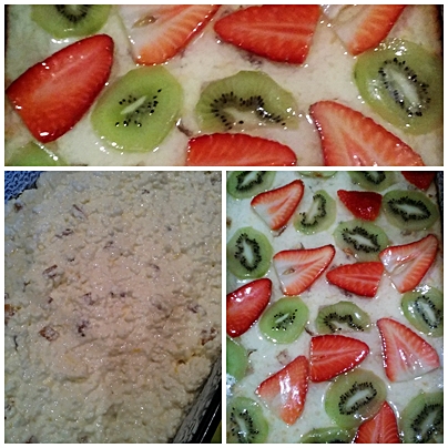 Tetejére: különböző gyümölcsök...jelent esetben: 3 db kiwi, 4-5 db nagyobb szemű eper, 1 cs. fehér torazselé