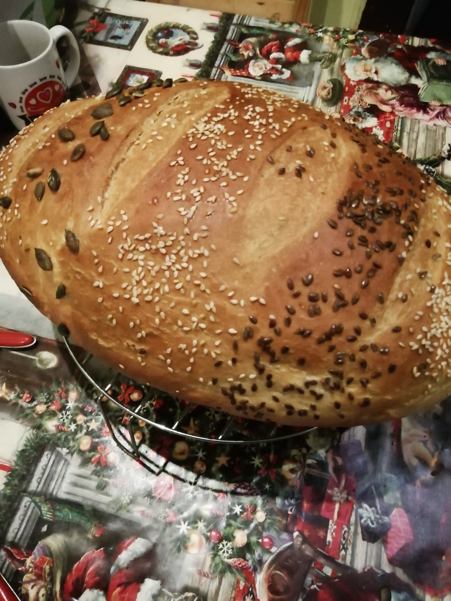 Lisztezett tálba tesszük, letakarjuk és kb 15 perc pihentetés után átgyúrjuk, majd letakarva duplájára kelesztjük. Vigyázzunk ne kelesszük túl! Megformázzuk a vekninket, én pléh kacsasütőbe készítek bele sütőpapírt, ebbe teszem bele a megformázott kenyérkét, amit ismét kelesztünk, kb. fél órát,itt is vigyázzunk a túlkelesztésre,mert szétreped. Ha szépen formásra kelt, 3-4 helyen bevágjuk a tetejét, lekenjük felvert tojással ,megszórjuk ízlés szerint magokkal, majd a kacsasütő tetejét rátesszük.