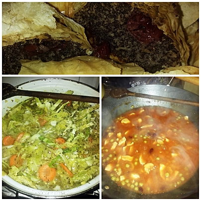 Menü: palócleves, grillcsirke rizi-bizi, aztán desszertnek asztalszilvás panettone, és készült két feketeerdő torta, egyik hagyományos ízesítéssel és díszítéssel, a másik selyemfűmézes karamell öntettel, mandulával és dióval